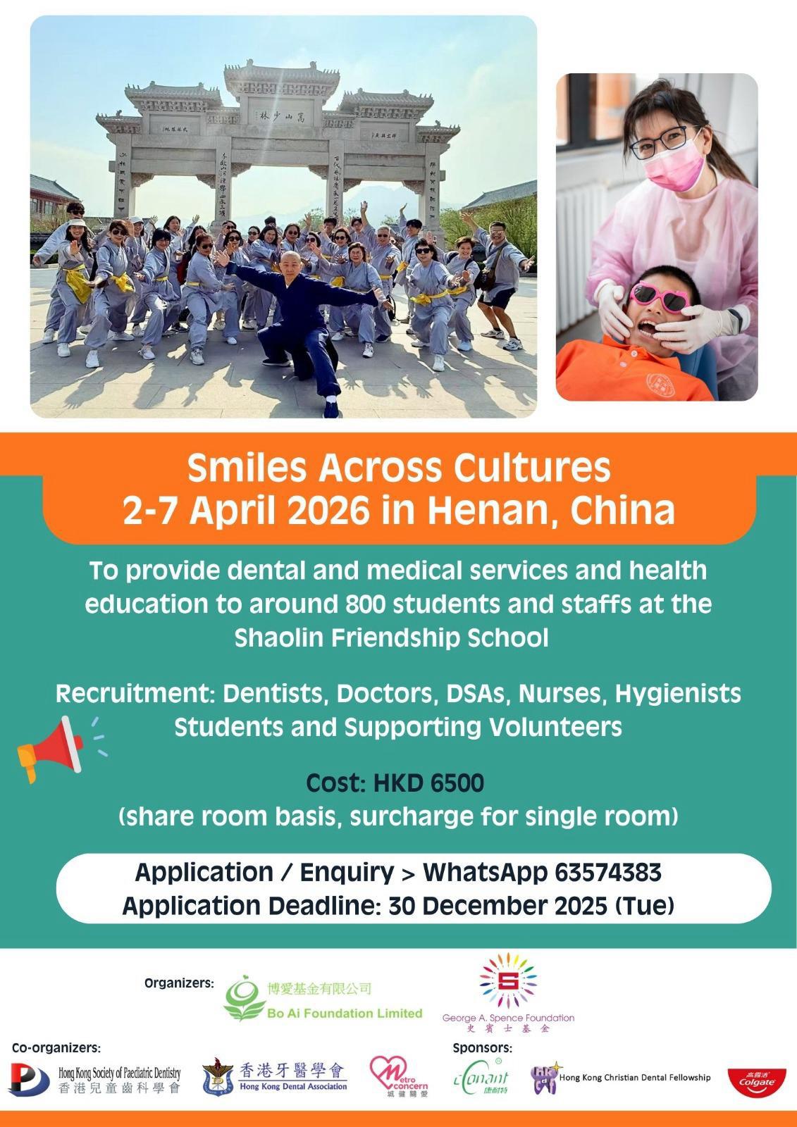 We are seeking passionate and dedicated volunteers to join us in providing free medical and dental services at the Shaolin Friendship School from April 2–7, 2026. Our work will include eye screening, dental screening, and treatments such as extractions, restorations, and scaling.